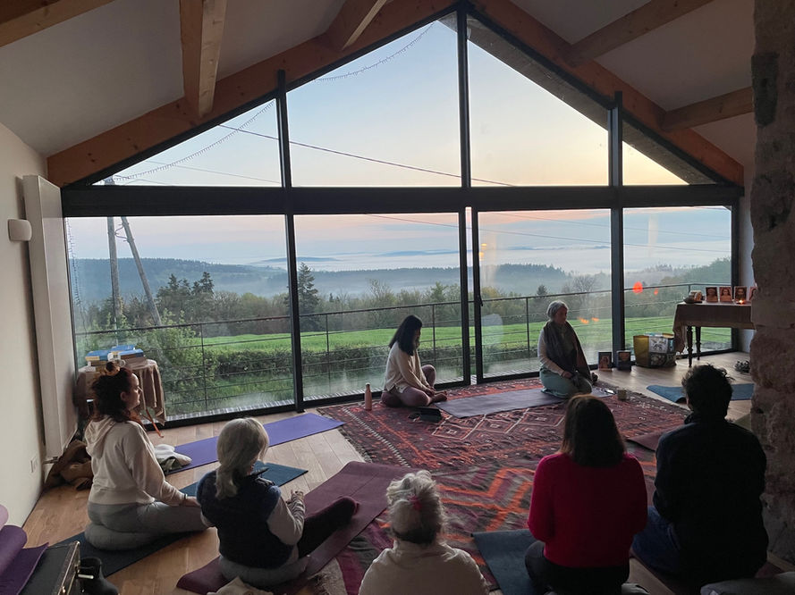 Elle comprend un coin salon. Tapis de yoga, coussins de méditation, ceintures et briques sont à disposition.